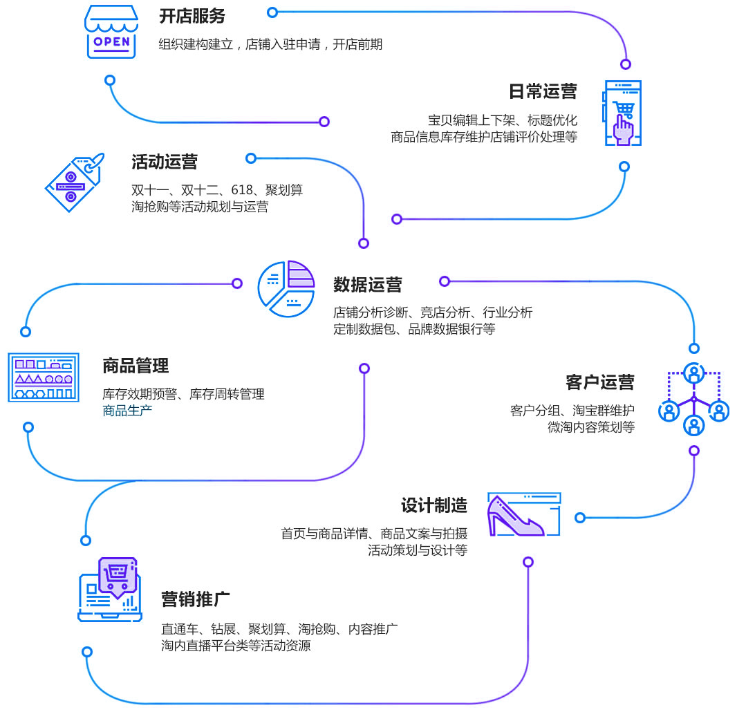 我們?yōu)槠髽I(yè)提供全電商平臺(tái)的一站式代運(yùn)營(yíng)方案,深入企業(yè)開展電商的每一個(gè)環(huán)節(jié)